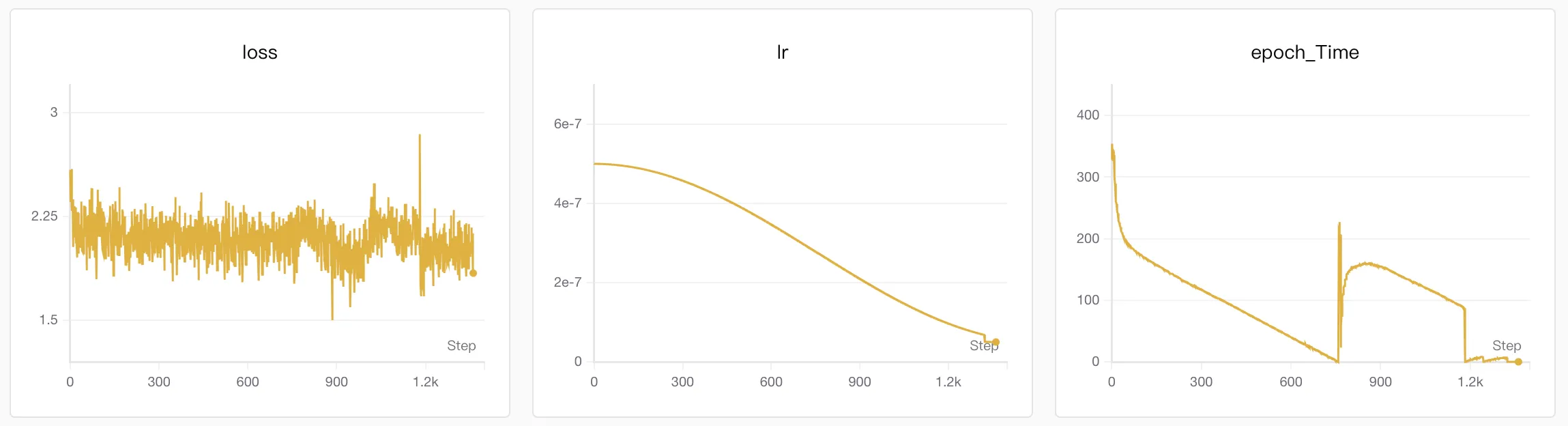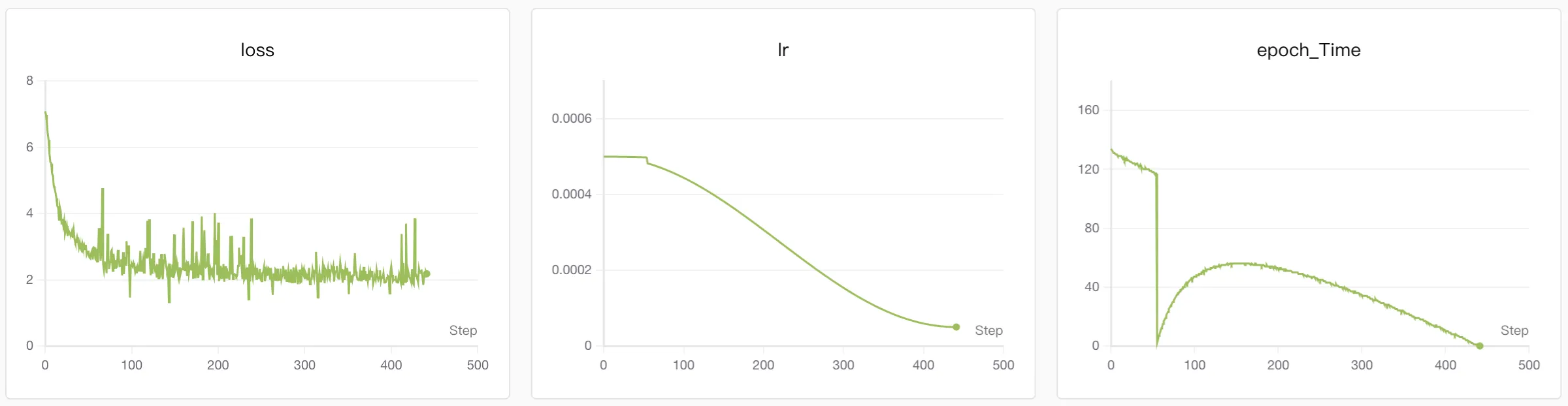 可以看到使用了余弦退火学习率,loss 中后期下降不明显,和原作者的 metrics 吻合。